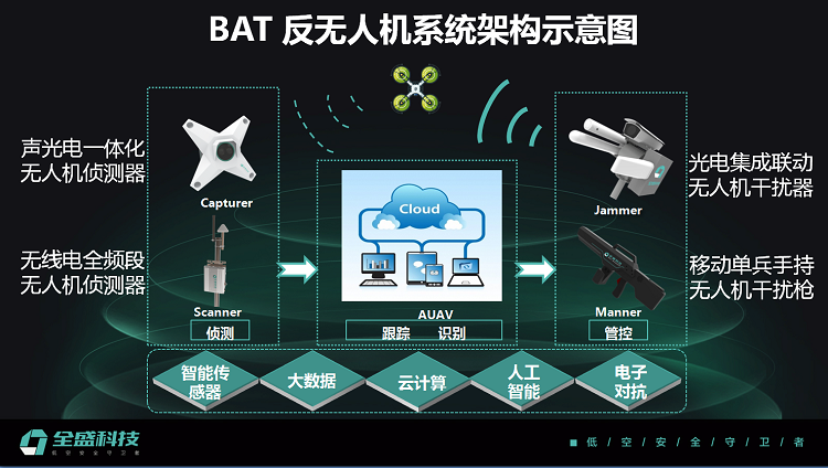 全盛科技目前致力于反无人机系统,电磁监控,数据采集、存储、处理等产品的研发和生产,以高新技术服务于公共安全与区域经济发展需求。当前,无人机市场正在蓬勃发展,滥用无人机和黑飞带来的安全问题日益凸显;公司潜心打造的具有自主知识产权的反无人机系统,可对低、慢、小目标进行有效侦测、跟踪、识别和管控,将传统的平面安防系统拓展为立体安防系统,突破并延伸了安防行业理念。全盛科技依托多年TMT产业研发、生产、 销售和服务的丰富经验,心怀“低空安全守卫者”的愿景,不断将智能传感器、人工智能和大数据技术融合于安防行业,为新一代立体安防提供全新的解决方案。
