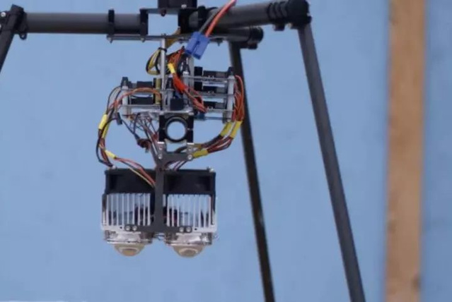 不过,在拍摄过程中,Sessler 和他的团队依然面临很多挑战。首先,灯光设备很难安装在无人机上;其次,无人机飞行时,每一个微小的动作就会导致光束的移动,而这在拍摄中会非常明显。为了克服这些挑战,Sessler 带领团队将多个100W的 LED 芯片安装在 MoVI 稳定系统,保持无人机在空中移动时光束也保持稳定。最终,团队搭建了三种灯光设备:900W 的探照灯,带抛物面镜的 400W 聚光灯和 Maxa Beam 氙灯。如下图所示: