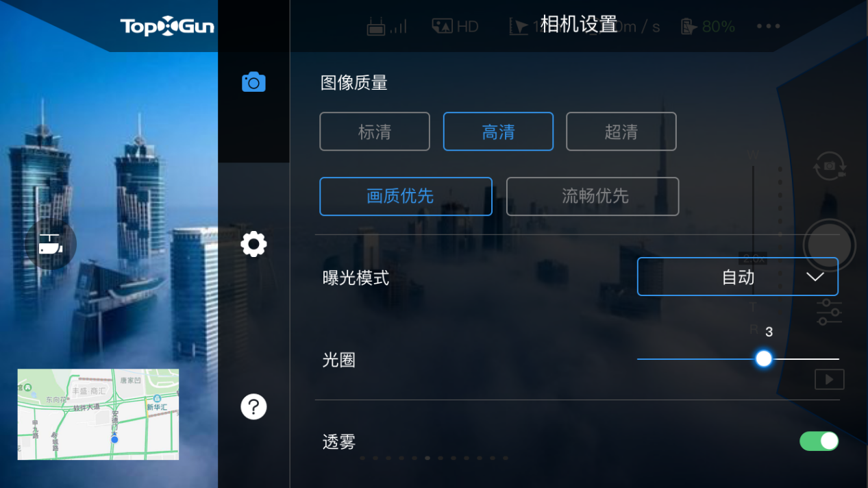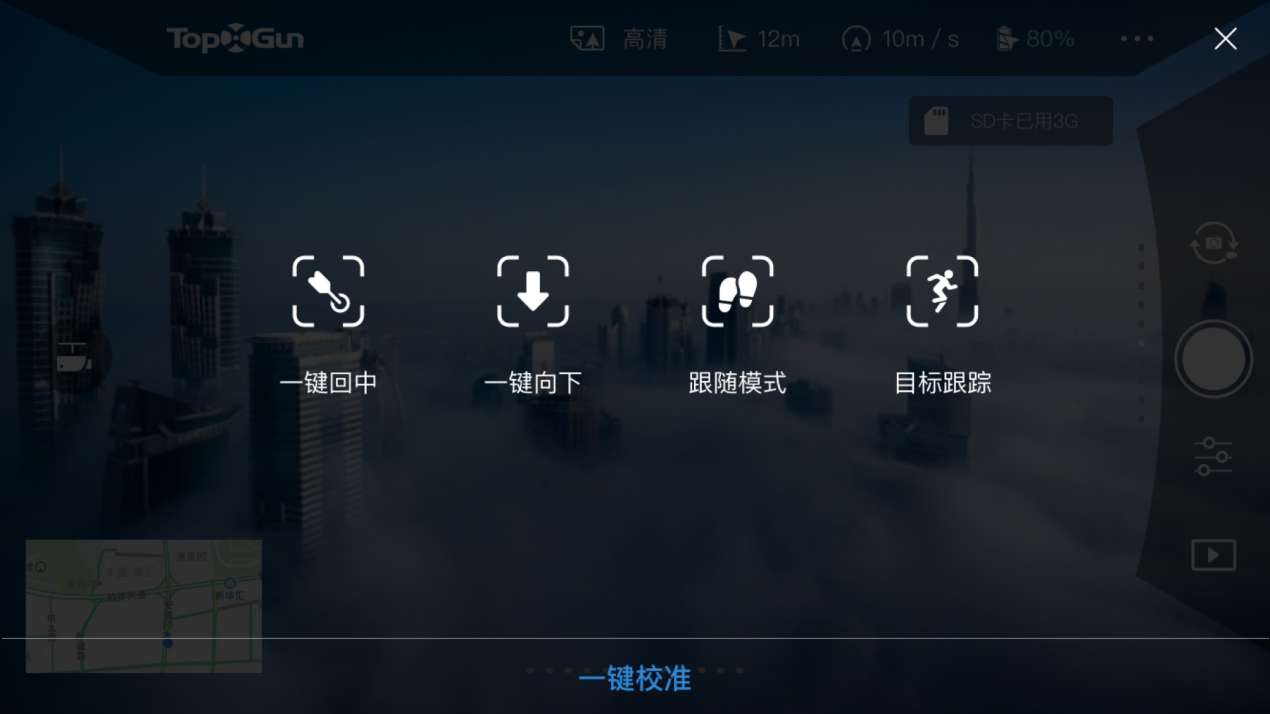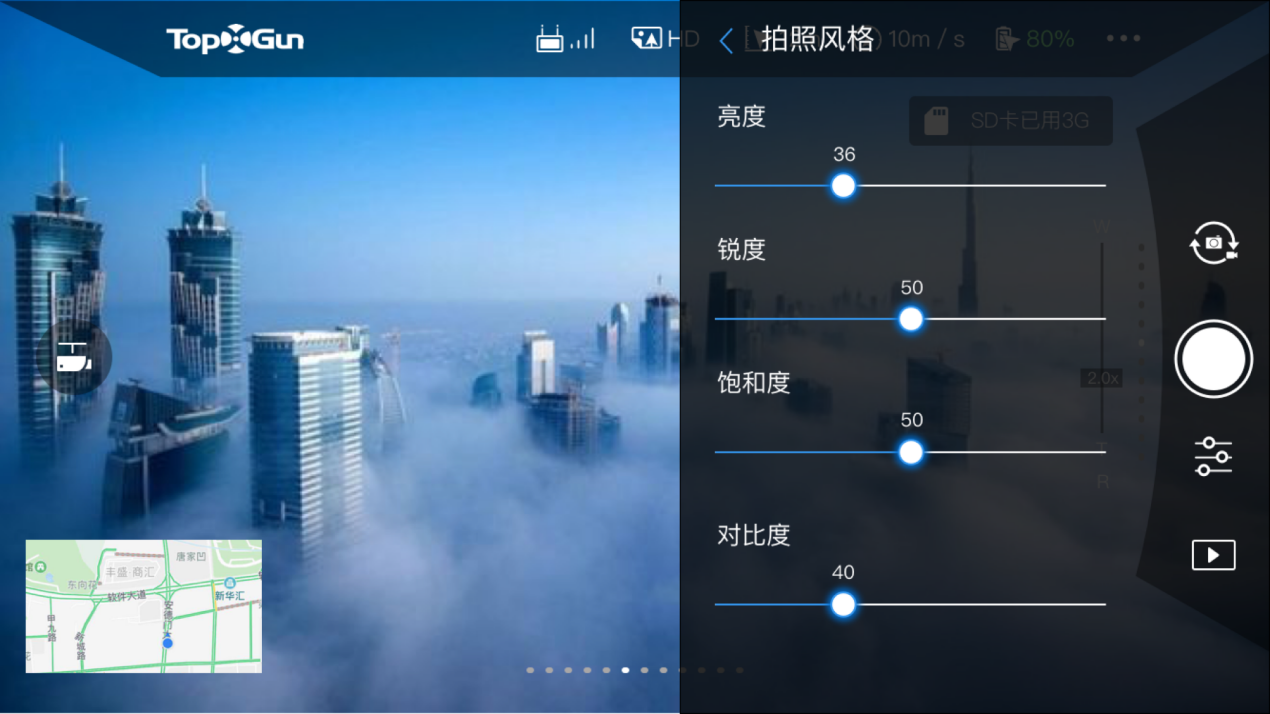 从软件截图中可以看到,新版的地面站云台界面中,上部为信号指示窗口,显示图传信号、飞行高度、飞行速度、电池电量、SD卡存储情况等一系列无人机相关参数。右侧为相机操作栏,可以实现拍照和录像功能的切换以及相机参数的调整。