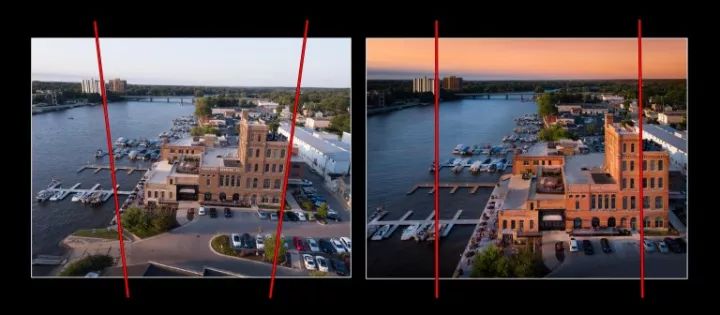 作为大疆无人机的用户兼航拍摄影师,我们已经习惯了与地面方向相反的汇聚线了。有时候,我们会在交付作品给客户之前,通过后期处理修正这种视觉偏差。
