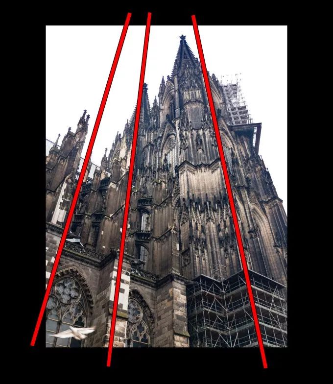 汇聚线通常出现在我们观察地面景物时,比如说,当我们仰望城市的高楼大厦,这些建筑会随着视线的上移逐渐变窄,而大脑却告诉我们每层楼的大小都是一样的。我们很少思考为什么看得越高越远,越会产生汇聚的现象。