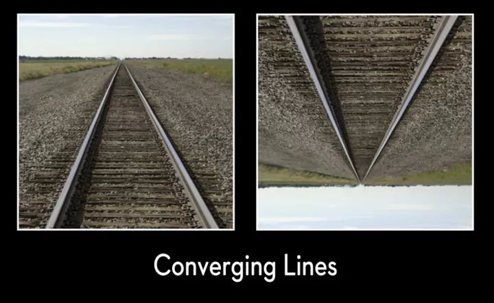 当我们从高处往下看的时候,同样会出现汇聚现象。然而这种从上至下的汇聚却会让大脑抗拒,因为这与平时我们所熟悉的汇聚线方向相反。这种视觉畸变会让我们觉得不适,失衡,甚至头晕。用上图的铁路举例,当线条从照片顶部向底部汇聚时,我们便会感觉怪异。
