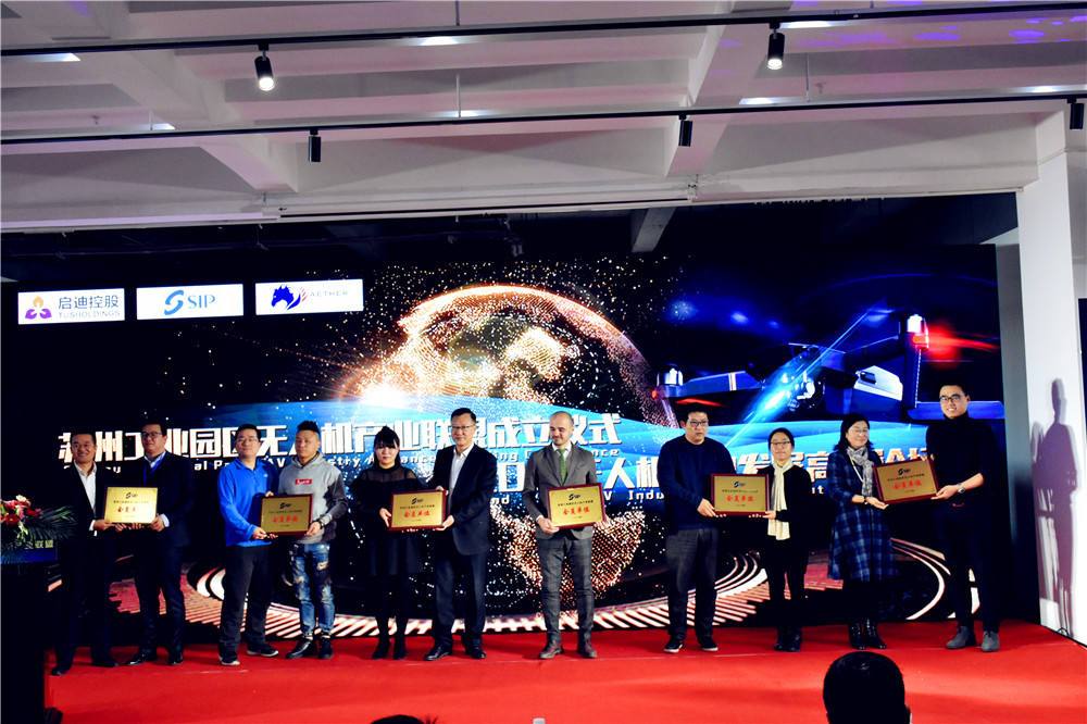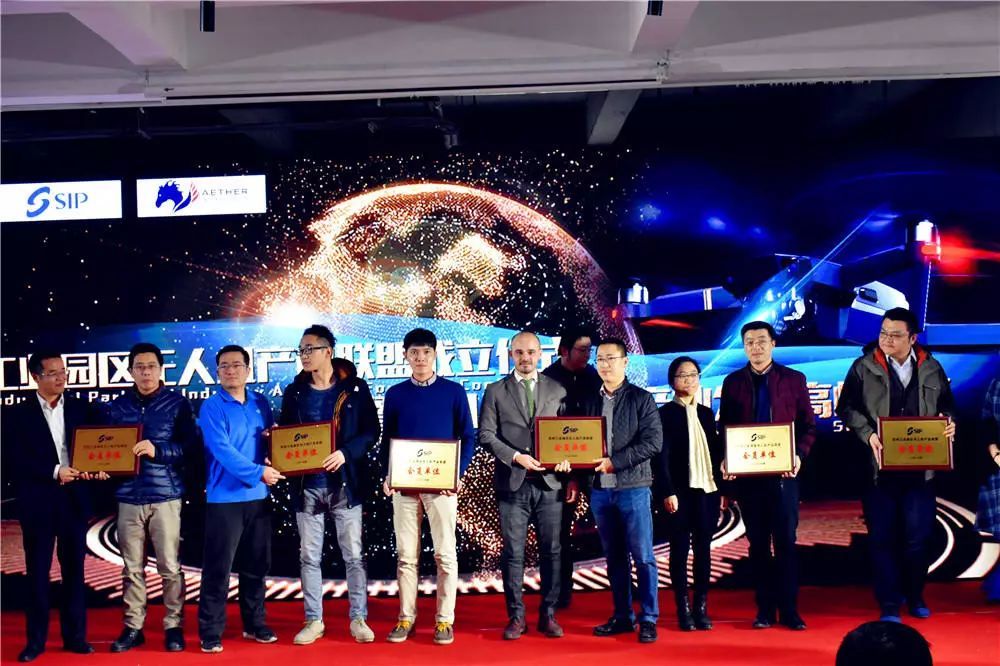 江苏亨通光载无限发展有限公司、浙江机器人产业集团、苏州启迪众创工社投资管理有限公司等27家单位被授予“无人机产业联盟会员单位”。