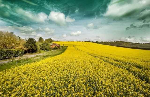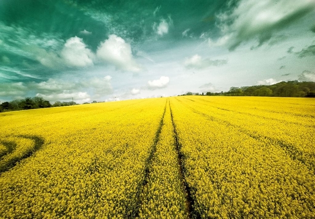 金色的油菜地,天空成了诡异的绿色。应该是用了滤镜。