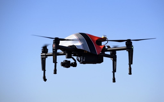 2017年12月14日,在美国洛杉矶消防局加利福尼亚的一次活动中,一名新闻摄影师拍摄了一段大疆无人机飞行的影像。