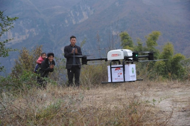 12月14日上午,“悬崖村”的村民围聚在村头,指着远处正加速赶来的无人机说到,对村民来说,这还是他们第一次见这玩意儿,这么一个小东西,能给村里带来什么好东西呢?
