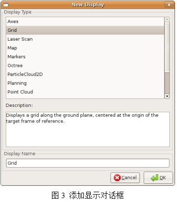 该对话框包括三项内容:显示类型、描述和显示名称。显示类型列表给出了该显示将要可视化的数据类型,描述给出了所选中显示的简要介绍,而显示名称则需要由用户输入一个独一无二的名字。例如,如果你的机器人有两个激光扫描仪,你需要创建两个“Laser Scan”的显示,可以将它们分别命名为“Lase Base”和“Laser head”。