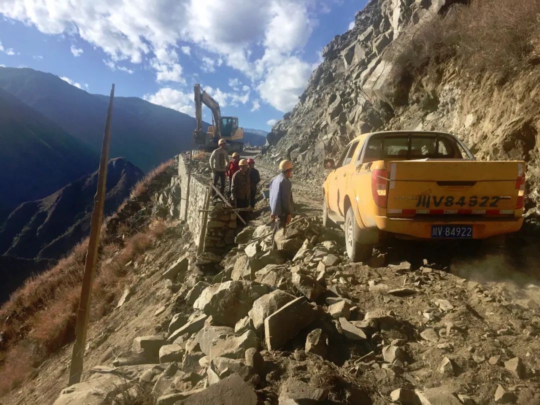 图为D在执行完任务的返回途中路遇塌方危险区域,防护措施几乎全部损毁,却依然笑嘻嘻地拍照发在群里,自嘲似地提醒大家出门记得买保险。
