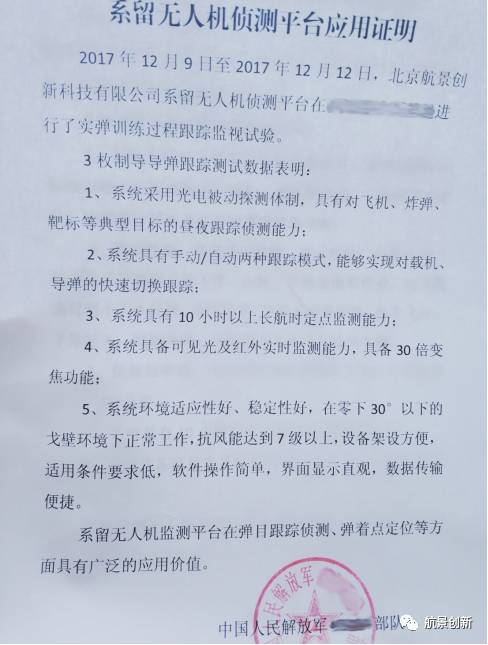 在演习评估会议中,基地领导对于无人机保障效果大为赞赏,高度评价了我公司产品的可靠性与实用性,并为“天机”、“天眼”产品开具战场应用证明。在会议上航景公司代表表示一定积极响应国家军民融合发展战略,基于航景多年来的技术经验,与军队共同摸索出适用现代战争环境的无人机应用方案,同时向军队提供优质的无人机相关服务。