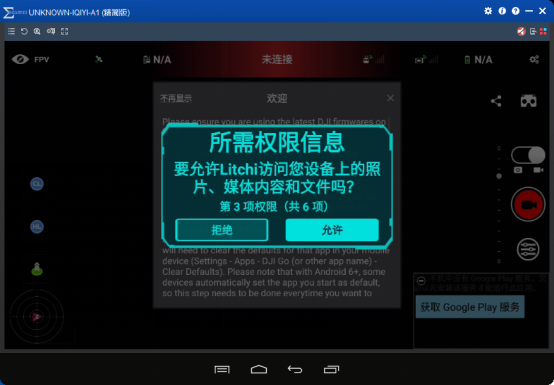 连接大疆遥控器后就会弹出是否打开litchi app,我们选择打开,然后第一次打开都会提示下面信息,我们全部选择允许(用奇遇VR手柄点击就可以),不然无法连接到飞机上