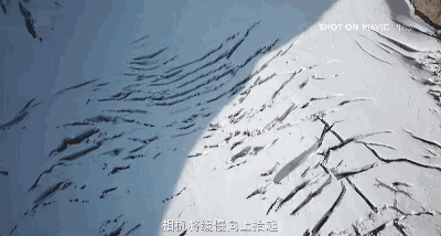 想要把白茫茫的雪景拍得更有画面感,可以选定远处的一座山峰为拍摄主体,推动油门让Mavic Pro飞向山峰,同时保持相机垂直朝向地面。慢慢地转动遥控器左上角的云台拨轮,相机将缓慢向上抬起,呈现周围景物。