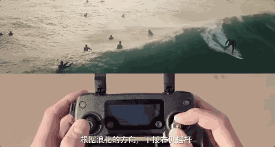 拍摄冲浪运动员的最佳角度,是在海浪打下的瞬间向后拍摄,而这意味着需要倒飞 才能完成。当寻找到合适的拍摄角度,你需要把飞行器悬停在海浪上方的安全高度,并将Mavic Pro的机尾朝向起飞区域,根据浪花的方向,拨动摇杆,让无人机随着浪花的方向倒飞,根据具体情况适当调整拨杆方向。