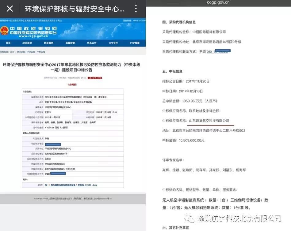 2017年12月18日,蜂巢航宇迎来了一则令人振奋的消息:由环境保护部核与辐射安全中心发起的“2017年东北地区核污染防控应急监测能力”公开招标项目,宣布由山东蜂巢航空科技有限公司(蜂巢航宇山东公司)中标。