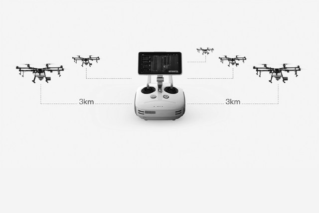 另外,针对效率作业,MG-1P 系列支持一控多机,一个遥控器最多可控制 5 架 MG-1P 系列植保机同时作业。遥控器控制距离达到 3000 米,支持同等距离高清图传,飞机之间还可以通过相互信号传输调整飞行状态,主动规避,保证飞行安全,当然最关键的还是减少不必要的人力资源。