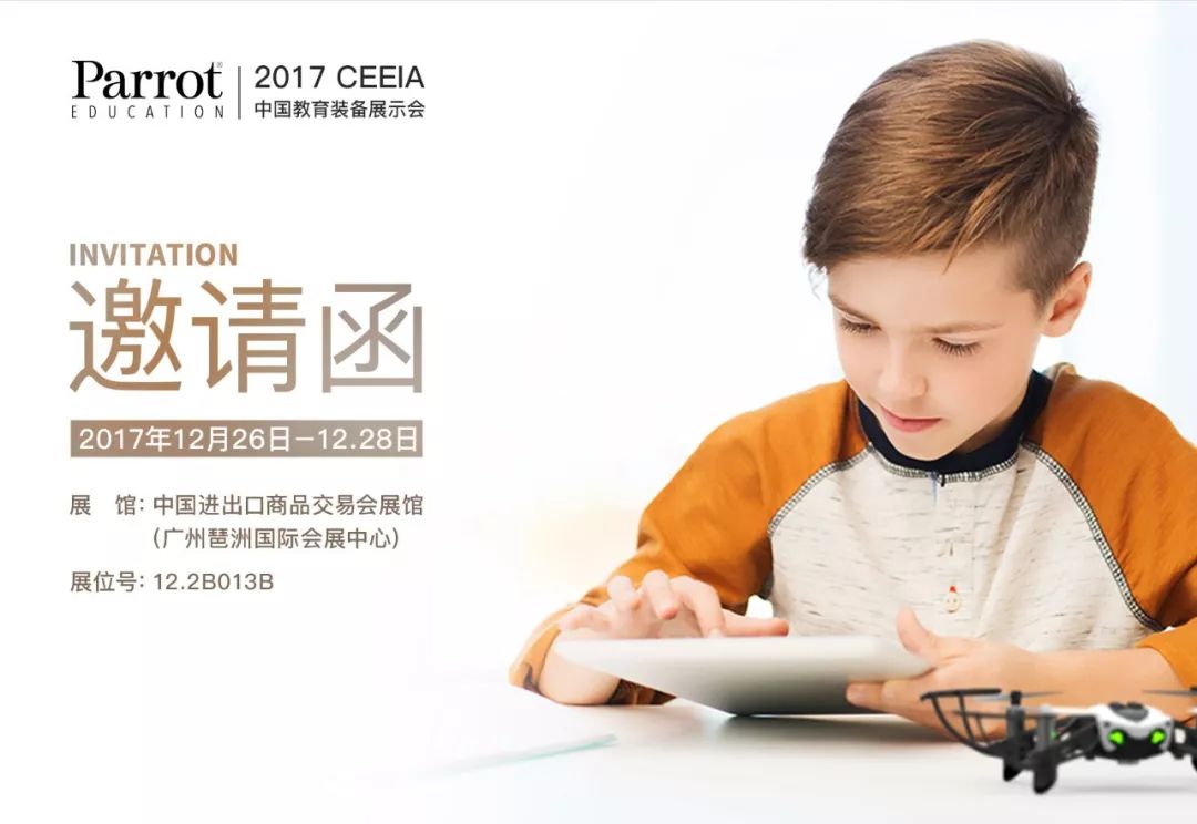 作为全球首家成功引入无人机教育的法国PARROT公司,将华丽亮相于2017年12月26日至28日在广州中国进出口商品交易会展馆举办的第73届中国教育装备展示会。本次展会以Parrot教育为主题,为您呈现一场别开生面的无人机教育“盛宴”.