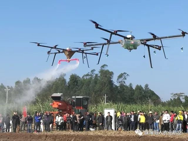 当天在大片大片的甘蔗林间,只见三架20升“谷上飞“多功能(喷洒功能、播撒功能、喷粉功能)大载荷农用无人机腾空而起,在园地一字排开,均匀喷洒、播撒、喷粉……先进的植保无人机在广袤的坡岭园地大显神通,植保无人机精彩的演绎,让300多名参会人员近距离享受了一场高科技的“甘蔗生产机械化盛宴”。