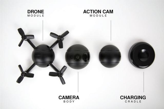 开箱,我们可以看到有一个相机、无人机模块、行动凸轮模块,你可以从不同角度得到剪辑集合。此外,你还可以将它放在充电底座上,当做一个安全摄像机。