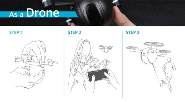这款无人机是采用扭锁设计,通过在空中、地面的无缝简单的模式变化工作:离开地面,在空中盘旋,开启跟踪模式,它就可以记录了。