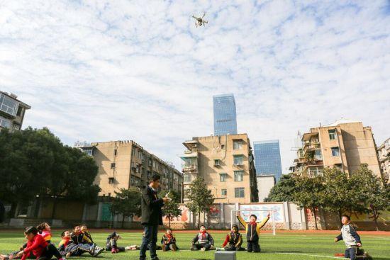 进入实际操作环节,随着一架白色旋翼无人机在操场上飞起,学生们按捺不住激动的心情,一起欢呼雀跃,用眼睛紧紧地追随着无人机的飞行轨迹,陪它一起盘旋、一起转弯、一起平稳落地。
