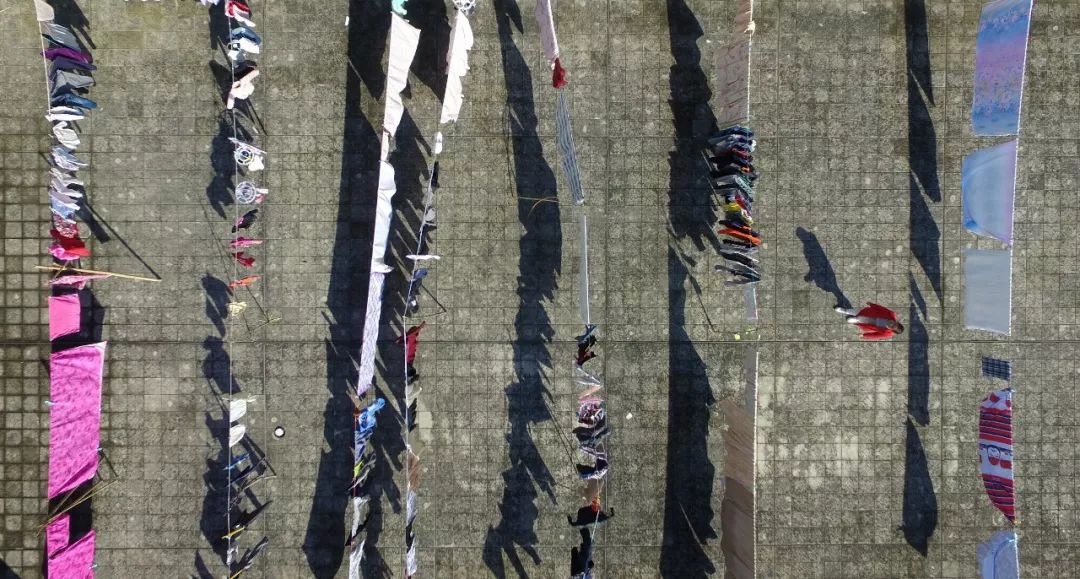 在卢政的无人机航拍视角下,阴雨天过后晒满被子的楼顶也同样值得记录:在清风中飞舞的被子加上人的点缀,生活的气息扑面而来,让人不禁回忆起童年生活玩耍过的弄堂和老街。