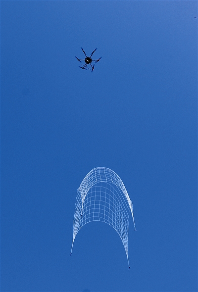 此时,另一架无人机早早就在空中待命,它快速锁定了“嫌疑人”,在他头顶盘旋。只听“啪”的一声,一张白色大网,从这架无人机上撒出,将地面上持刀的“嫌疑人”网住,民警快速上前,三下五除二就把“嫌疑人”控制住了。