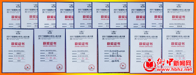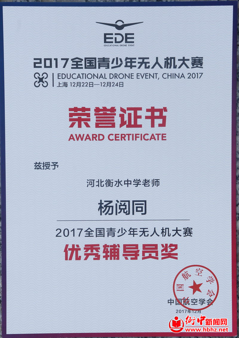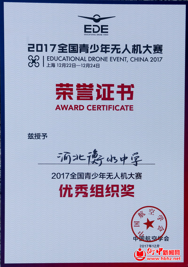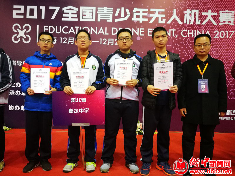 本次大赛由中国科协青少年科技活动中心等单位指导,中国航空学会主办,是青少年教育无人机领域的首次全国性比赛。大赛主要考核青少年的无人机组装能力、无人机操作水平、团队合作意识、手脑协调能力和快速应变能力等。我校航模社团八名学生组成两支队伍参赛,分别代表衡水市模型运动协会和河北衡水中学。经过激烈角逐,孙之昊、王川岳、孙振宁、董承睿荣获高中组团体接力赛一等奖,李南丁、张杰凯、李子轩、王辉荣获高中组团体接力赛三等奖,同时孙之昊、王川岳两名同学荣获个人赛二等奖,李南丁、张杰凯、孙振宁、董承睿、李子轩、王辉六名同学荣获个人赛三等奖,辅导教练杨阅同荣获优秀辅导员奖,我校荣获优秀组织奖。