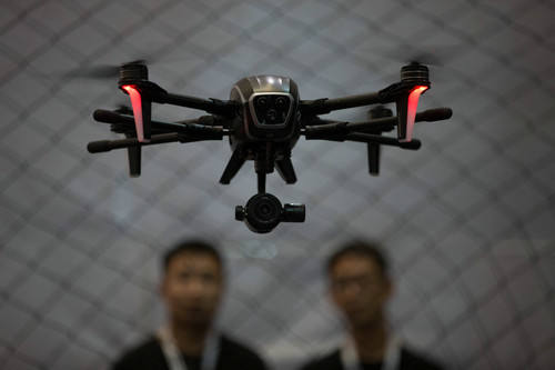 遥控飞行器吸引了大批观众来到展位,它们在高空以密集的队形表演。身着色彩鲜艳的夹克衫的工作团队操控工业用无人机快速飞行,展开运送包裹和喷洒仿制杀虫剂等项目的竞赛。