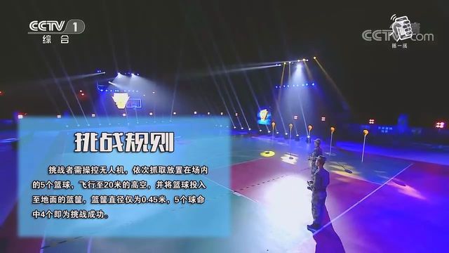 按照挑战规则,挑战者需操控无人机,依次抓取放置在场内的5个篮球,飞行至20米的高空,并将篮球投入至地面的篮筐,篮筐直径仅为0.45米,5个球命中4个即为挑战成功。