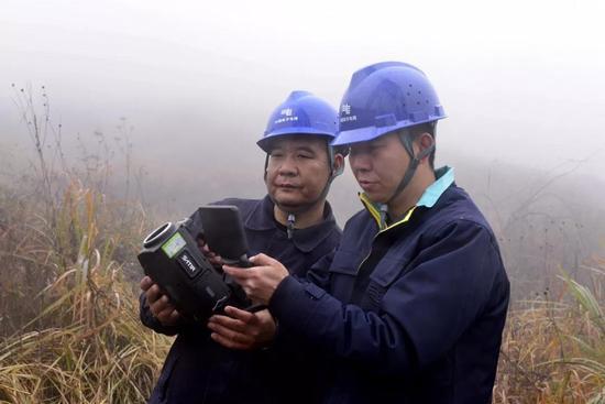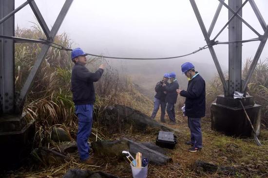 韶关供电局输电管理所工作人员在乳源瑶族自治县红云镇红光村的110千伏大梅线开展防冰特巡。