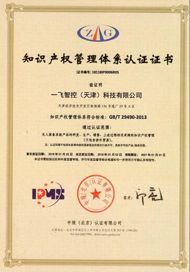 一飞董事长兼CEO齐俊桐表示,通过国家级知识产权管理体系认证,既是对一飞知识产权工作的肯定及激励,也标志着一飞知识产权管理工作又迈上一个新台阶。未来,一飞还将积极参与并主导行业标准制定,通过专利导航、布局,成为行业健康、发展的引导者。