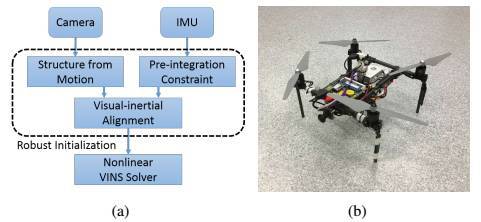 图1.(a)本文方法初始化过程的结构图。(b)用于室内闭环实验,带前置相机的四旋翼飞行器。