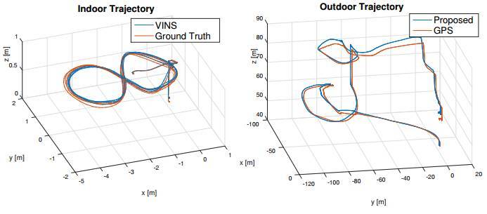 图3.本文算法在室内/室外实验结果。Groundtruth分别采用OptiTrack和GPS的结果。