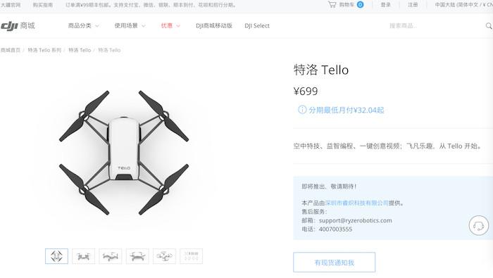 如果说这家公司您没听过,那它的母公司您一定知道。根据天眼查的信息,睿炽科技由大疆建立,出资比例 100%;此外,我们发现 Tello 已经在大疆官方商城上架,售价 699 元,相比大疆无人机数千元的售价,它便宜到让你感觉不买对不起孩子和自己。总体来看,睿炽科技是一家由大疆成立,主要面向平价无人机市场的子公司。