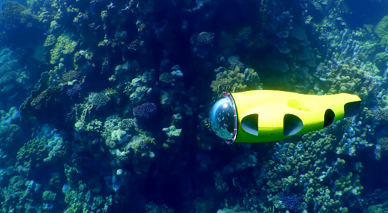 水中阻力大,所以无人机的速度也很重要。设计时速为2.2英里/小时(3.5公里/小时≈1米/秒),所以在水中无人机也十分灵活。可以用无线手环控制,可以设置自动跟随,可以在目标附近两三米的地方跟踪拍摄。也能自动避开障碍物。另外产品音量十分小对海洋生物的影响也降到最低。