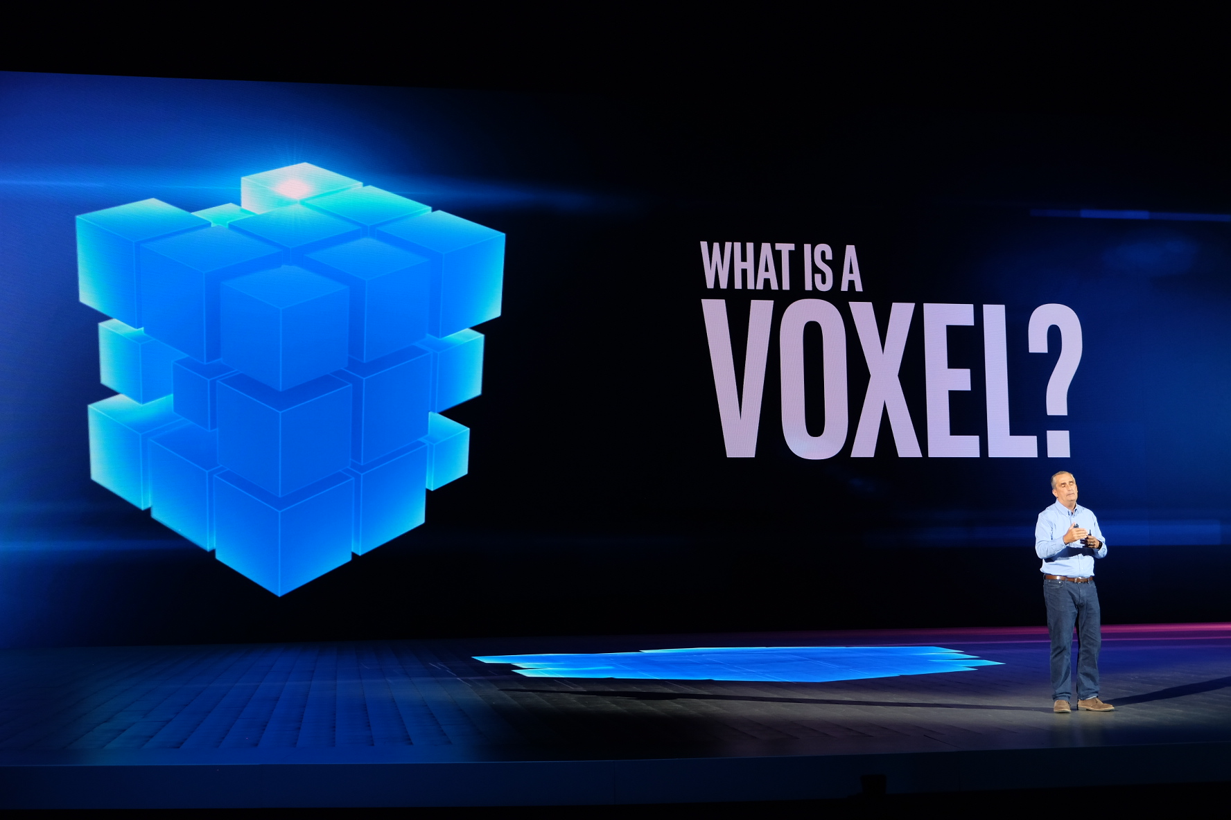 科再奇介绍了一种名为 TRUE VIEW 的技术,通过在观众席周围安装多个分辨率高达 5k 的摄像头,这种技术能够为观众定义整个赛场的三维空间数据,不同于平面的「像素(pixel)」,英特尔将这种组成三维空间的数据点称为三维像素 Voxel,即为「空间+像素 volume+pixel」,这种数据点将进一步为立体视频画面增强景深和立体感。