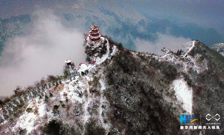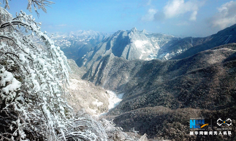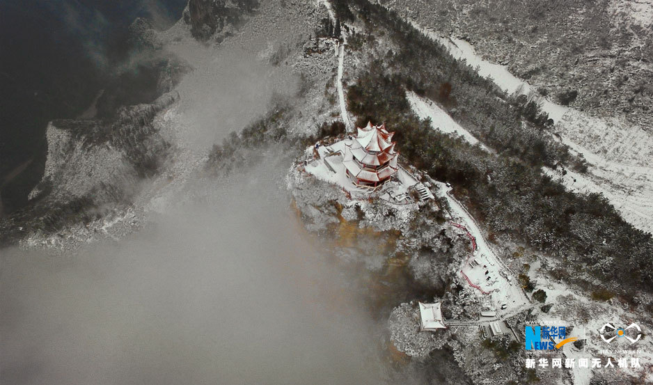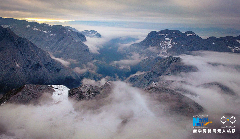 图为无人机航拍视角下的重庆市巫溪县兰英大峡谷,雪雾迷蒙。