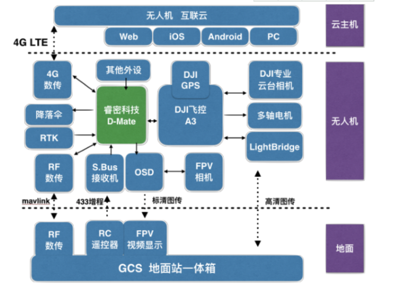 D-Mate是一款硬件产品也是一个工业级应用平台。使用DJI专业飞控(如A3)为控制核心,获得了极为可靠的安全性和高水准的飞行品质,同时支持扩展全部DJI 配件,如云台相机、 RTK 系统、冗余避障系统、Lightbridge高清图传系统、M210/M600 pro 开发套件等。基于D-Mate作为工业开放平台,可方便地接入第三方无人机配件,如4G数传、流量计、液位计、抛投器、航测相机等,并为客户进行精准的软件、硬件定制开发,从而满足行业客户的苛刻需求。