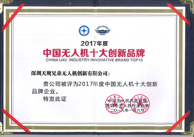 2018年1月6日,由深圳市无人机行业协会、中国无人机产业联盟、中国无人机竞速联盟及深圳市彩虹鹰无人机研究院共同主办的2018第三届无人机百人会在深圳举行。天鹰兄弟受邀参加,并荣获2017年中国无人机十大创新品牌奖。