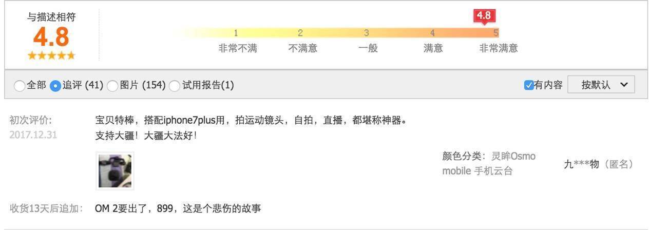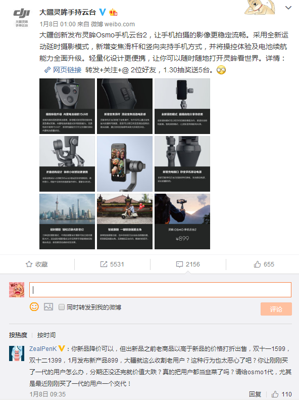 而这一次或许是大疆并不明智的市场举动。我们关注到原本售价需要2000元的大疆Osmo Mobile 1代产品也由于二代的发布降价到1399元,而购买了这一代产品的消费者也十分后悔,纷纷在评论区吐槽。而在大疆的官方微博下面,我们也能看到不少类似的吐槽,这次大疆真的是“摊上事了”。