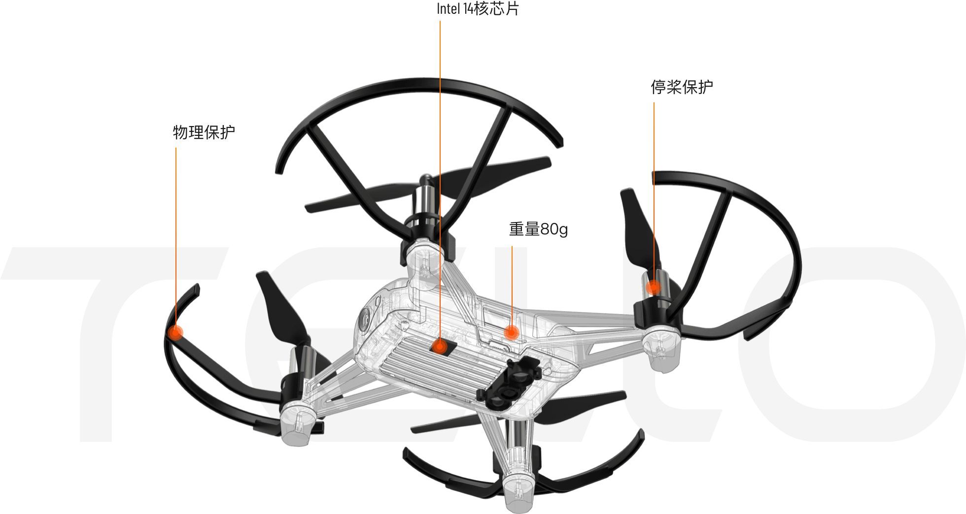 Tello 使用了柔性桨叶,配有护桨,同时具有低电保护和自动起降功能,当用户停止操控时,Tello 会精准地悬停在空中,不会发生漂移。这些稳定性和安全性上的提升都来自于英特尔和大疆视觉处理和飞行技术的强强结合。此外,曾被各种自拍无人机大力鼓吹的抛飞、掌上降落等功能,在 Tello 这里也是小菜一碟。