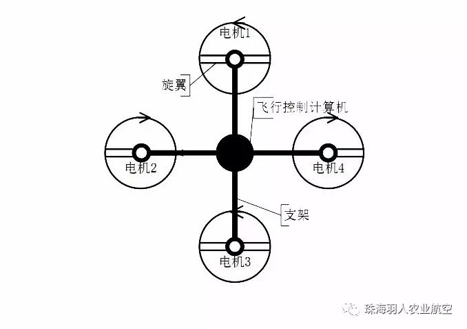 旋翼对称分布在机体的前后、左右四个方向,四个旋翼处于同一高度平面,且四个旋翼的结构和半径都相同,四个电机对称的安装在飞行器的支架端,支架中间空间安放飞行控制计算机和外部设备。结构形式如图所示。