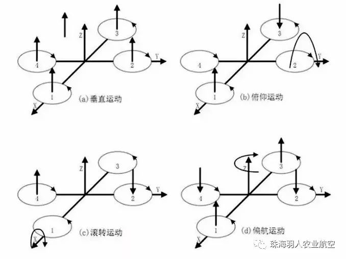 在上图中,电机1和电机3作逆时针旋转,电机2和电机4作顺时针旋转,规定沿 x轴正方向运动称为向前运动,箭头在旋翼的运动平面上方表示此电机转速提高,在下方表示此电机转速下降。