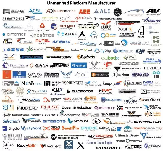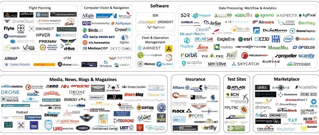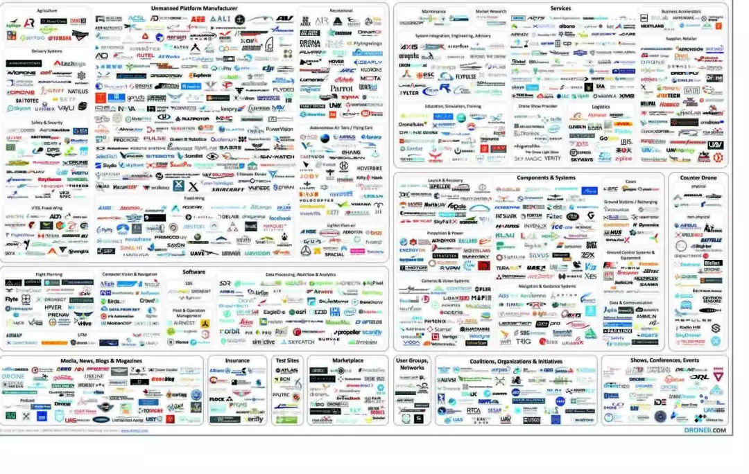 Drone Industry Insight 的无人机生态系统地图(https://www.droneii.com/wp-content/uploads/2018/01/Drone-Market-Environment-Map-2018.pdf,大小:11 MB)为无人机行业中最活跃和最相关的玩家提供了一个很好的概述。地图限制在 1000 名玩家,专注于那些对无人机市场产生最大影响的公司和人员,重点关注无人机生态系统的多样性和广度。我们还能发现在这个生动的市场中可能会错过的玩家,利用地图找到可以为理想的合作伙伴提供的技术和组织。