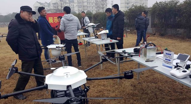 2018年1月19日,安徽芜湖,众多农村种田大户、农机行业专家和相关工作人员正在现场观摩无人机种植培训演示。农村种田现在都可以用上这些无人机了,以前想都不敢想!你知道吗?