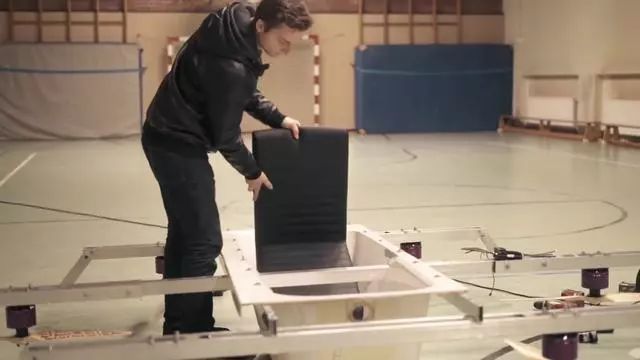 将蓝皮带当作绑带,用以固定放置在无人机下面的坐垫。里面的座椅也是可拆卸的,电池模组固定在金属框架上,充好电需要三个小时。