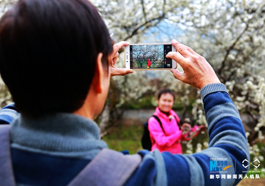 “你来拍,我来照。”两位游客在李树下留住美丽的瞬间。