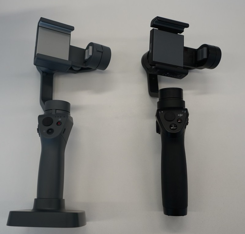从外观来看,一代的 Osmo以金属材质打造,呈曜石黑色,看上去较为大气,拿在手上也感觉比较结实。反观 Osmo Mobile 2 因改为使用胶质作主要材质,重量锐减至约 485 克,虽然轻便,但灰色台身相比下予人廉价之感,视觉效果不佳。不过在价格比一代低一半的情况下,记者认为这个缺点在可接受范围之内。如若于日常自用, Osmo Mobile 2 已可满足要求。