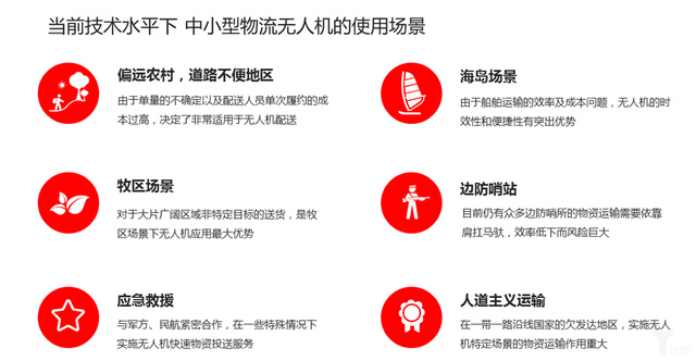 首先第一个是我们之前所定位的偏远的农村和道路不便的地区,这些地区因为我之前的成本高,我用无人机以后,我的成本比城市里配送还是要高一点,但是比之前比如配送员的人呀、车呀,各种各样损耗加一起还要低,再一个农村电商增长是我们国内电商市场里增长率最快的,我们也是看到这块巨大的市场,而且还有一个很关键的问题,就是说我们不能因为农村偏远或者说它消费力水平比较低,我们就不给他送,这个首先从我们的人道主义关怀或者商业的情怀来说是不允许的,所以我们希望能够给一些偏远山村同样能够提供同质同价的服务。还有就是海岛场景,比如给印尼送非常困难,我们在印尼设了点,要在印尼进行空中配送,当然海岛场景有一个比较大的特点,它的风,海的延误,我们在技术上要做一个大的保障。