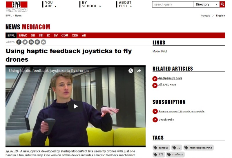 4 人邀请该校飞行学会干事 Julien Perroud 试用手柄。Julien 事后表示,触控手柄操作简单,「我相信没有经验的人也能『很快上手』。」他们早在毕业前已成立初创公司 MotionPilot,并获得多个奖项和资助。MotionPilot 在瑞士初创企业比赛(2017)获得 130,000 瑞士法郎奖金,以及在欧洲大学初创企业比赛 European Student Startups 2017 中胜出。
