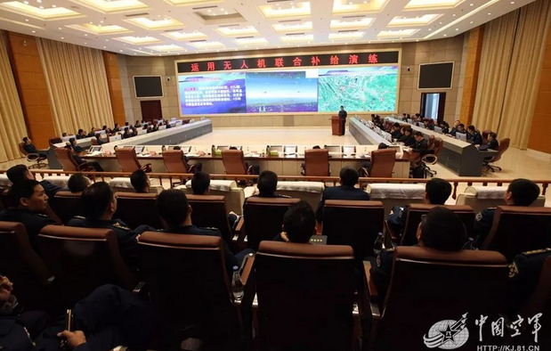 室外演练现场人员与飞机虽然紧迫感十足,但远在“千里之外”的空军后勤部指挥中心人员却从容不迫的通过大屏幕指挥和观看演练现场。指挥中心的屏幕上将室外演练的无人机飞行实时拍摄的画面、物资补给路线轨迹、机场至投送地航线规划图、吊舱空投示意图、投送地实时情况等一系列的画面传回指挥大厅,指挥员可通过现场情况随时调整飞行路线,从而实现灵活,机动性作战。